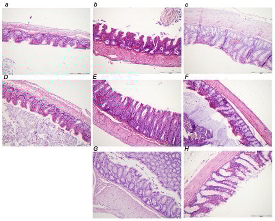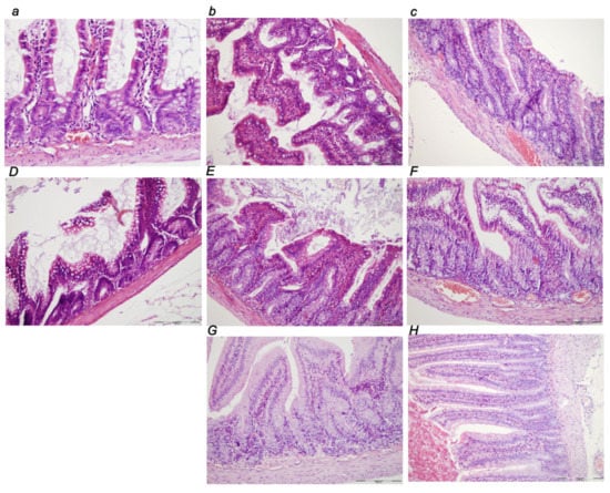 As in previous studies [,,,,,,,,], we used a histologic scoring scale adapted from Chui and coworkers [] for the intestinal tissue damage, scoring 0–5 (normal to severe) in three categories (mucosal injury, inflammation, and hyperemia/hemorrhage) for a total score of 0 to 15, as described by Lane and coworkers []. Illustratively, the assessment included the morphologic features of mucosal injury (i.e., different grades of epithelial lifting, villi denudation, and necrosis), inflammation (i.e., focal to diffuse, according to lamina propria infiltration or subendothelial infiltration), and hyperemia/hemorrhage (i.e., focal to diffuse, according to lamina propria or subendothelial localization).