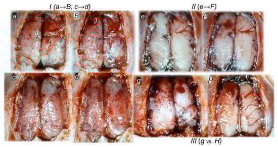 After complete calvariectomy, recordings of brain swelling (before procedure, after ligation and therapy application, and before sacrifice) followed the procedure previously used in our vascular studies [,,,,,,]. The calvariectomy procedure included, medially to the superior temporal lines and temporalis muscle attachments, 6 burr holes drilled in three horizontal lines (just basal from the posterior interocular line (two rostral burr holes), just rostral to the lambdoid suture (and transverse sinuses) on both sides (two basal burr holes) and in line between the basal and rostral burr holes (two middle burr holes)).