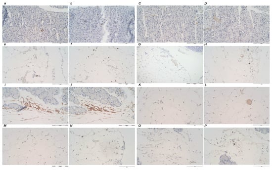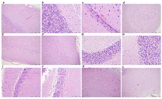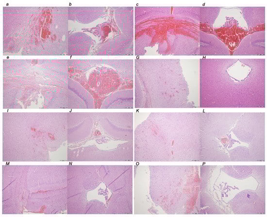 As described in the previous studies [,,,,,,,,], the brain was dissected according to NTP-7, at Level 3 and 6 with neuroanatomic subsites presented in certain brain sections using coronal sections with three mandatory sections. We used a semiquantitative neuropathological scoring system, and the sum of the analyzed affected areas (0–4) (i) and karyopyknotic cells in the brain areas (0–4) (ii) made (i) + (ii) a combined score (0–8) as follows. (i) Specific affected brain areas (0–4) (score 0 indicates no histopathologic change), cerebral (NTP-7, Level 3), cerebellar cortex (NTP-7, Level 6), hippocampus, thalamus, and hypothalamus (NTP-7, Level 3) were assessed as follows: small, patchy, complete or incomplete infarcts (≤10% of area affected) (score 1); partly confluent or incomplete infarcts (20–30% of area affected) (score 2); large confluent complete infarcts (40–60% of area affected) (score 3); total disintegration of the tissue in the cortex; large complete infarcts (>75% of area affected) in the hypothalamus, thalamus, and hippocampus (score 4). (ii) Karyopyknotic cells in the affected brain areas (0–4) (score 0 indicates no change), cerebral (NTP-7, Level 3), cerebellar cortex (NTP-7, Level 6), hippocampus, thalamus, and hypothalamus (NTP-7, Level 3) were analyzed as follows: a few karyopyknotic neuronal cells (≤20%) (score 1); patchy areas of karyopyknotic cells (50%) (score 2); more extensive karyopyknotic areas (75%) (score 3); complete infarction (100%) (score 4).