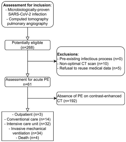 Exclusion criteria were patients with another pre-existing infectious process (n = 0), non-optimal CT scan, incomplete CT data (n = 10), or documented refusal of the reuse of medical data (n = 5). Of the 268 screened patients, 61 (23%) had PE proven upon CTPA and were included for further analysis. Clinical and demographic data were retrieved from electronic records. The sample size estimation was designed for 80% power and 5% type-one error rate. Under the assumption that PE distribution is independent of lung inflammation, we analyzed at least 182 lung segments with PE to detect a 20% increase in PE within segments with AO. Details on the design and rationale were reported in the study protocol []. A flow chart of the study population is shown in Figure 1. The protocol was approved by the local Ethics Commission (project-ID 2020-01469).