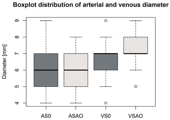 Boxplot distribution of arterial and venous diamters. Plots represent vascular diameters measured in A6 and V6 and classified according to the presence of COVID-19 pneumonia (AO) in the same lung segment. Venous diameters were significantly higher in diseased segments (p = 0.031). AO, alveolar opacity; AS0, arterial diameter in segments without alveolar opacity; ASAO, arterial diameter in segments with alveolar opacity; VS0, venous diameter in segments without alveolar opacity; and VSAO, venous diameter in segments with alveolar opacity.