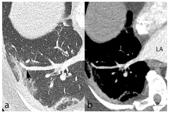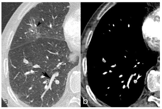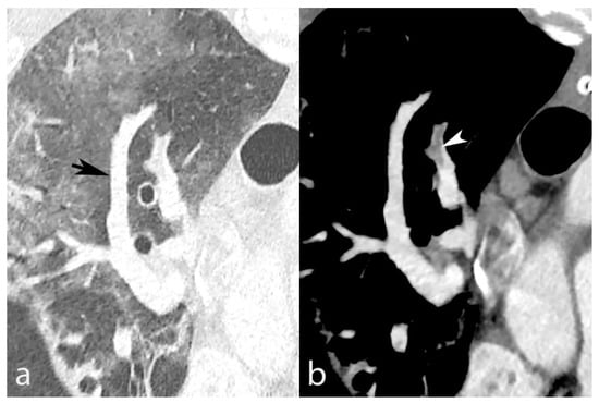 Mild AO in the right middle lobe (panel (a), black arrowhead), without associated VC in an 85-year-old man. On the other hand, distinct VC is seen in the right lower lobe (panel a, black arrow) with concomitant PE (panel (b), white arrowhead), supporting the potential role of VC in PE’s distribution.