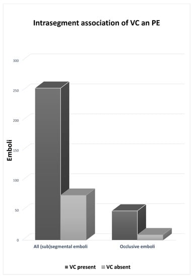 Out of the 329 segmental and subsegmental emboli (excluding the main pulmonary artery and lobar emboli), 254 (77%) were located in segments presenting concomitant VC. Out of 58 completely obstructive emboli, 49 (84%) were located in segments having VC (Figure 4). The rate of segmental emboli tended to be higher in segments with VC without reaching statistical significance (28.3% vs. 23.1%, p = 0.07). More details are provided in Table 3, including the effect of AO severity. In segments with VC, the most common associated features were AO > 50% (449/896, 50%) and AO < 50% (413/896, 46%). Segments with VC and no AO were infrequently observed at 34/896 (3.8%).