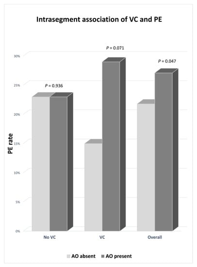Intrasegment association of VC and PE. Graph shows the association between the rate of segmental or subsegmental PE found in segments with or without VC, respectively, stratified by the presence of AO. In the absence of VC, AO does not influence the PE rate. Conversely, when VC is present, AO markedly affects the probability of PE (n = 254 emboli). Statistical significance is reached only in the whole population due to higher statistical power (n = 329 emboli).