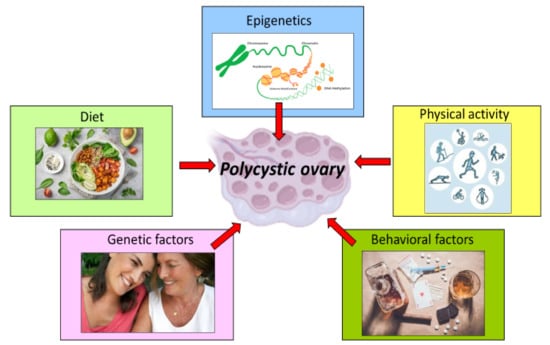 Moreover, lifestyle factors influence the PCOS course and prognosis. Despite the progress that has been reached in its diagnosis and management, little is known about the molecular mechanisms and signaling pathways underlying the pathogenic mechanisms. In this sense, recent research has suggested that the influence of multiple factors, including age, environment, lifestyle and the disease state environment, can change the clinical presentation of PCOS via epigenetic modifications. In the present review, the molecular and epigenetic mechanisms of diet and physical activity are discussed, with a particular attention on their positive influence in the management of the disease and their efficacy as nonpharmacological ways of intervention (Figure 1).
