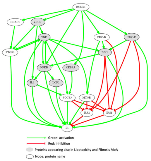 In this study, the predicted MoAs were aimed at the elucidation of the mechanisms of RUNX1 activity that leads to the promotion of NAFLD motives: (A) IR and (B) lipotoxicity and fibrosis mechanisms. A set of 250 biologically plausible solutions have been calculated, with a mean accuracy of 94%.
