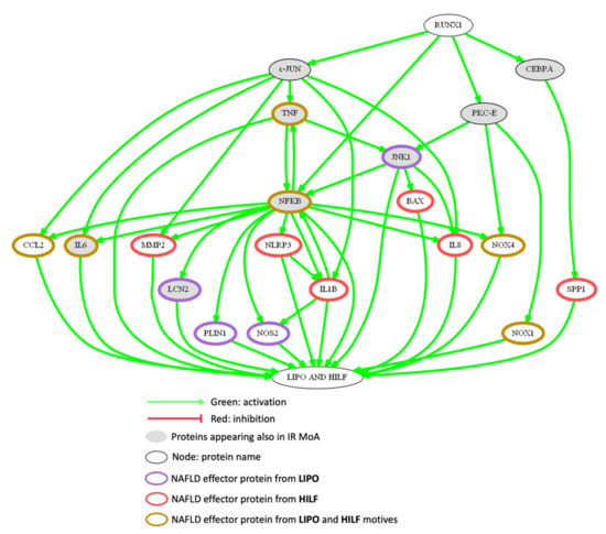 The last main objective of the present study is to analyze the overlapping proteins between the studied motives involved in NAFLD. In this sense, the shared proteins between IR and lipotoxicity most activated by RUNX1 are JNK1, IKBKB, MTOR, and LCN2, while the most inhibited by RUNX1 is SIRT1. On the other hand, the overlapping proteins observed in lipotoxicity and fibrosis motives that are the most positively modulated by RUNX1 mechanisms are NADPH oxidase NOX1 and NOX4, the chemokine CCL2, the cytochrome CYBB, and the TLRs 2, 4, and 9. The only effector that is shared between IR and fibrosis negatively modulated by RUNX1 is PTEN. Finally, the main contribution of this study is that we found five RUNX1-regulated proteins with a direct involvement in the three main NAFLD motives, which are NFκB 1, NFκB 2, TNF, ADIPOQ, and IL-6. These proteins are indicators of the relevance of their processes in terms of the relationship with RUNX1 mechanisms towards promoting NAFLD. NFκB1 and TNF present a high activation due to RUNX1 activity, as we explained above. In fact, NFκB-dependent pathways seem to definitely be a key element in these MoA due to its high number of up/downstream links, and for its important regulation of a lot of effector proteins of these motives, especially immune response-related proteins that trigger inflammation, fibrosis, or lipotoxicity [96].