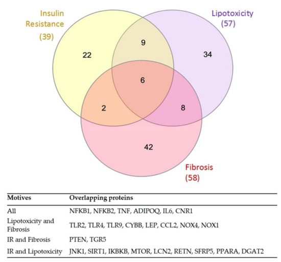 Overlap of effector proteins between the three NAFLD motives evaluated in the project: VENN diagram showing the number of effector proteins overlapping between the three indicated NAFLD motives. There are 39 proteins involved in IR mechanism, 57 in lipotoxicity, and 58 in fibrosis. Concretely, there are 9 proteins involved in IR and lipotoxicity, 6 in lipotoxicity and fibrosis, and only 2 in IR and fibrosis. In this regard, there are six proteins involved in the three motives of NAFLD pathogenesis: NFκB1, NFκB2, TNF, ADIPOQ, IL-6, CNR1. IR, insulin resistance; NFKB, nuclear factor kappa B; TNF, tumour necrosis factor; ADIPOQ, adiponectin; IL6, interleukin 6; CNR1, cannabinoid receptor 1; TLR, toll-like receptor; CYBB, cytochrome b-245 heavy chain; LEP, leptin; CCL2, C-C motif chemokine 2; NOX, NADPH oxidase; PTEN, phosphatase and tensin homolog; TGR5, G protein-coupled bile acid receptor-1; JNK1, c-Jun N-terminal kinase; SIRT1, sirtuin 1; IKBKB, inhibitor of nuclear factor kappa B kinase subunit beta; MTOR, mammalian target of rapamycin serine/threonine-protein kinase; LCN2, neutrophil gelatinase-associated lipocalin 2; RETN, resistin; SFRP5, secreted frizzled-related protein 5; PPARA, peroxisome proliferator-activated receptor alpha; DGAT2, diacylglycerol O-Acyltransferase 2.
