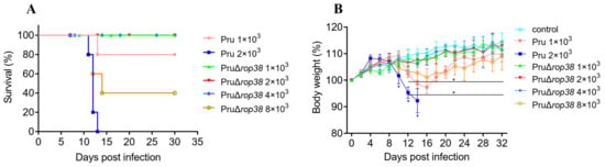 Pathogenicity of PruΔrop38 in mice. (A) Survival rate and (B) body weight gain of CD-1 mice infected with the parental Pru strain or the PruΔrop38 strain. Pru (1 × 103 and 2 × 103) or PruΔrop38 (1 × 103, 2 × 103, 4 × 103, and 8 × 103) tachyzoites were injected intraperitoneally (i.p.) into mice (n = 5), and daily monitoring of mice for 30 days (presented as the mean of body weight ± SD; * p < 0.05; one-way ANOVA with Tukey).