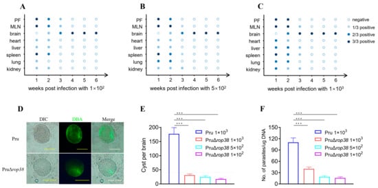 Dynamic distribution and effect on brain parasite burden of PruΔrop38 in mice. Amplification results of T. gondii-specific genes from organs and tissues in mice. Injections of (A) 1 × 102, (B) 5 × 102, and (C) 1 × 103 PruΔrop38 tachyzoites, respectively. (D) Cyst counts were performed on brain homogenates by DBA-FITC staining, brain cyst from mice injected with PruΔrop38 and Pru were observed using a fluorescence microscope. (E) Immunofluorescence assays determined the number of brain cysts of Pru and PruΔrop38. Pru (1 × 103) or PruΔrop38 (1 × 102, 5 × 102, and 1 × 103) tachyzoites were injected intraperitoneally (i.p.) into mice (n = 5) for 30 days. (Cyst walls of T. gondii were labeled with DBA-FITC (green), Scale bar = 50 µm). (F) The number of parasites and DNA concentration in each brain tissue were detected by calculating the 529 gene of Toxoplasma and the 28S rRNA gene of the brain with quantitative real-time PCR, the load of parasites = number of parasites/DNA concentration of brain tissue (presented as the mean ± SD; *** p < 0.001; one-way ANOVA with Tukey).