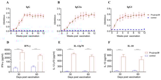 Humoral and cellular immune responses induced by PruΔrop38. Levels of IgG and its subtype (IgG2a and IgG1) antibodies in the serum obtained from vaccinated and control mice. (A) IgG, (B) IgG2a, and (C) IgG1, respectively (n = 3; weekly serum collection after immunization). The levels of cytokines in the suspension of splenocyte in vaccinated and control mice. Splenocytes were collected at 30 or 60 days post-vaccination and co-incubated with TSA (50 μg/mL), and the levels of (D) IFN-γ, (E) IL-12, and (F) IL-10 were analyzed by ELISA (n = 3; presented as the mean ± SD; *** p < 0.001; Student’s t-test).