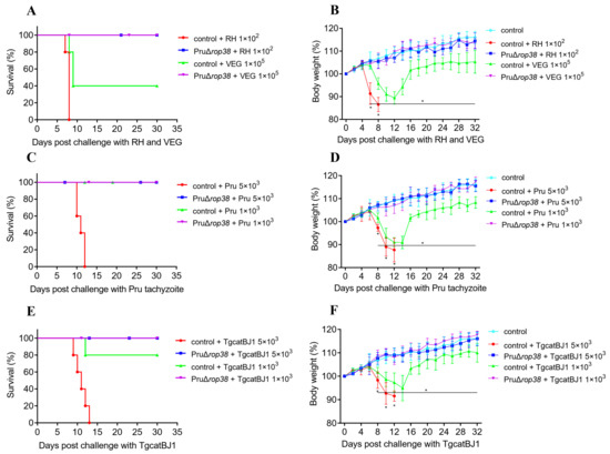 Protective efficacy against varied genotypes of tachyzoite challenge. Survival rate and body weight gain of vaccinated and control mice re-challenged with (A,B) RH (1 × 102) and VEG (1 × 105) tachyzoites, (C,D) Pru (1 × 103 and 5 × 103) tachyzoites, and (E,F) TgCatBj1 (1 × 103 and 5 × 103) tachyzoites, respectively. (n = 5; mice were injected intraperitoneally (i.p.); daily monitoring of mice for 30 days; presented as the mean of body weight ± SD; * p < 0.05; one-way ANOVA with Tukey).