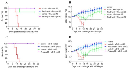 Protective efficacy against varied genotypes of cyst challenge. Survival rate and body weight gain of vaccinated and control mice re-challenged with (A,B) Pru (20 and 10) cysts and (C,D) ME49 (20 and 5) cysts (n = 5; mice were injected orally; daily monitoring of mice for 30 days; presented as the mean of body weight ± SD; * p < 0.05; one-way ANOVA with Tukey).
