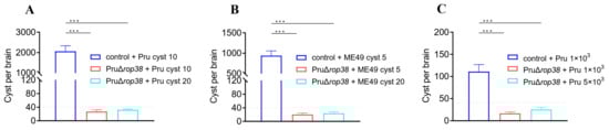 Another aspect of evaluation of the protective efficacy against chronic infection is the brain parasite burden, so we counted the number of brain cysts in mice challenged with type II strains. The average number of cysts in control mice challenged with 10 Pru cysts, 5 ME49 cysts, and 1 × 103 Pru tachyzoites was 2062, 940, and 111, respectively (Figure 6A–C). However, the number of cysts in vaccinated mice was about 27 (p < 0.001), 20 (p < 0.001), and 17 (p < 0.001), respectively. Additionally, the number of cysts in vaccinated mice challenged with 20 Pru cysts, 20 ME49 cysts, and 5 × 103 Pru tachyzoites (lethal doses in control mice) was 32 (p < 0.001), 24 (p < 0.001), and 25 (p < 0.001), respectively. Vaccination with PruΔrop38 has the ability to significantly reduce the brain parasite burden of the challenging type II strains and provide protection against T. gondii chronic infection.