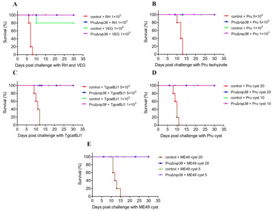 The duration of immunity with PruΔrop38. Survival rate of vaccinated and control mice re-challenged with (A) RH (1 × 102) and VEG (1 × 105) tachyzoites, (B) Pru (1 × 103 and 5 × 103) tachyzoites, and (C) TgCatBj1 (1 × 103 and 5 × 103) tachyzoites, (D) Pru (20 and 10) cysts, and (E) ME49 (20 and 5) cysts, respectively (n = 5; mice were injected with tachyzoites intraperitoneally (i.p.) or with cysts orally; daily monitoring of mice for 30 days).
