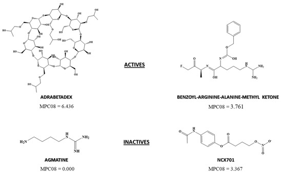 Both models were built using a path count descriptor (MPC08) implemented inalvaDesc version 2.0.6, Lecco (Italy), 2021 [40]. This index, obtained from a hydrogen-depleted molecular graph G, encodes the number of paths of order 8 that can be identified in a molecule. As this descriptor takes a positive value for DFClass_6LU7 equation, a higher number of paths of order 8 in a molecule results in a greater chance of exhibiting anti-SARS-CoV-2 activity. Figure 3 shows that compounds with MPC08 value greater than 3.7 are considered active by the DFClass_6LU7 model (for instance adrabetadex and benzoyl-arginine-alanine-methyl ketone) while those with lower values are labeled as inactive (agmatine and NCX701). Agmatine has a MPC08 value of zero, as no path of order 8 is present in its structure. It appears that there is an optimal number of paths of order 8 above which it is possible to establish a correlation with anti-SARS-CoV-2 activity. This is probably because NCX701 contains a path of order 8 in its structure, despite being labeled as inactive. This chemo-mathematical feature may also be correlated with biochemistry when considering a possible correlation with the steric space of the molecules inside the catalytic pocket of the protein. A higher volume of the ligands indicates a higher probability to establish interactions.