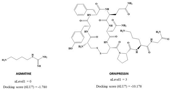 Table S5 shows that almost all drugs with a low docking score value (potential protease inhibitors) exhibit a value of 3 on this descriptor. On the other hand, higher values of docking score (non-protease inhibitors) are related to ligands exhibiting 0 value at nLevel1 chirality descriptor do not have a chiral center. Figure 4 shows two drugs as an example of this pattern highlighted by the nLevel1 descriptor; Ornipressin exhibiting a low docking score value (potential protease inhibitors) and adopting a value of 3 on this descriptor, and Agmatine with a predicted higher docking score value (non-protease inhibitors) and adopting a 0 value for the nLevel1 descriptor.