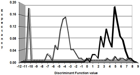 Linear discriminant analysis in topological QSAR enables the plotting of frequency distribution diagrams, called Pharmaceutical Distribution Diagrams. These diagrams represent the frequency of the number of molecules within an interval of values of the discriminant function vs. these values [47]. The plot provides a straightforward way of visualizing the regions of minimum overlap between active and inactive compounds; DF regions with the highest expectancy of finding active molecules and range of applicability domain for a DF. For an arbitrary range of values of a given function, an “expectancy of activity” can be defined as Ea = a/(i + 1), where “a” is the number of active compounds in the range divided by the total number of active compounds and “i” is the number of inactive compounds in the interval divided by the total number of inactive compounds. The expectancy of inactivity is defined in a symmetrical way, as Ei = i/(a + 1).
