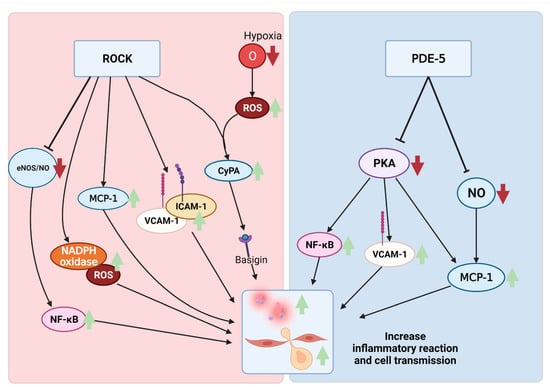 Improvement of the inflammatory response and recruitment of inflammatory cells due to various factors in the ROCK and PDE family. CyPA: cyclophilin A; ICAM-1: intercellular adhesion molecule 1; MCP-1: monocyte chemoattractant protein 1; NF-κB: nuclear factor kappa-light-chain-enhancer of activated B cells; NO: nitric oxide; PDE-5: phosphodiesterase-5; PKA: protein kinase A; ROCK: rho-associated protein kinase; ROS: reactive oxygen species; VCAM-1: vascular cell adhesion molecule 1.
