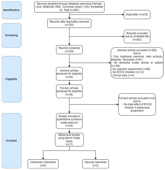 The ROCK inhibitor study was conducted independently by two reviewers according to the screening criteria. The studies were selected in the following order: (1) Duplicate articles were excluded. (2) Those with unrelated titles were excluded. Subsequently, (3) those with unrelated abstracts were excluded, and the exclusion considerations for the abstracts were as follows: only traditional medicine, herb extracts, alkaloids, and flavonoids. No dementia model animal or patient. No cognition assessment. No ROCK inhibitors. No clinical trials. (4) The following text was checked to exclude articles that did not study the effect of ROCK inhibitors on behavioral experiments. (5) Studies included in the quantitative synthesis. (6) Finally, only studies using the Morris water maze were left.