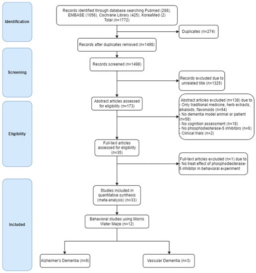 The phosphodiesterase-5 inhibitor study was performed independently along with the flow chart by two reviewers: (1) Duplicate articles were excluded. (2) Publications with unrelated titles and abstracts were excluded. (3) According to the eligibility, publications that had no therapeutic effect in the behavioral experiment were excluded. (4) Full-text articles that were not available for meta-analysis, that had no animal, cognition, or Morris water maze test, were excluded.