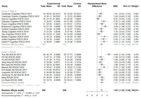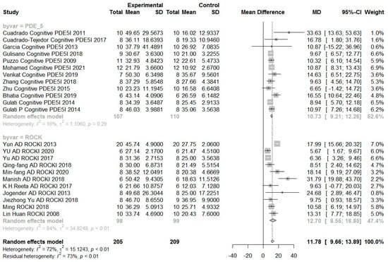 Mice, who received all treatments, had an average of 11.78% MD (95% CI 9.66–13.89, I2 73%) more cognitive improvement. Among them, mice treated with PDE-5 inhibitors had 10.73% MD (95% CI 9.21–12.26 I2 16%) cognitive improvement, while mice treated with ROCK inhibitors had 12.70% MD (95% CI 8.55–16.85 I2 84%) cognitive improvement. The biggest MD improvement noted among publications on ROCK inhibitor treatment was in the report Cuadrado Cognitive PDE5I 2011, showing a difference of 33.63% (95% CI 13.63–53.63) MD. Conversely, the least MD difference was 6.65% (95% CI −1.42–14.72), which was reported by Zhu Cognitive PDE5I 2015. Among the reports on PDE-5 inhibitor treatment, the most obvious difference in MD was 31.79% (95% CI 19.88–43.70), as reported by Manish AD ROCKI 2018. On the other hand, the PDE5I treatment with the smallest MD difference was YU AD ROCKI 2020, which reported an improvement of 5.67% (95% CI 1.67–9.67).