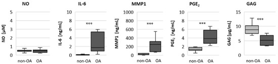 Basal release of NO, IL-6, MMP1, PGE2 and GAG from non-OA (number of patients (N) = 8) and OA (N = 10) human hip chondrocytes. Statistics: non-OA vs. OA chondrocytes, Mann–Whitney U Test. *** p < 0.005.