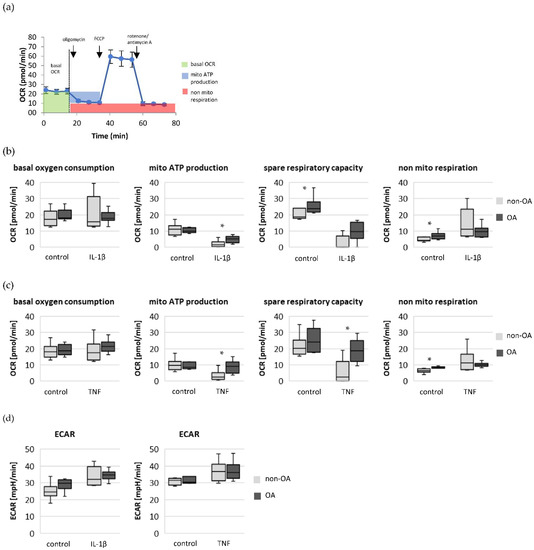 Basal oxygen consumption rate, mitochondrial ATP production, spare respiratory capacity, non-mitochondrial respiration and ECAR of non-OA and OA chondrocytes. (a) Schema of the OCR measurement with application of oligomycin, FCCP and rotenone + antimycin A. (b) OCR values of unstimulated (control) and IL-1β-stimulated cells (non-OA patients = 6, OA patients = 7). (c) OCR values of unstimulated (control) and TNF-stimulated cells (non-OA patients = 6, OA patients = 6). (d) Comparison of ECAR values of unstimulated (control), IL-1β-stimulated (non-OA patients = 6, OA patients = 7) and TNF-stimulated cells (non-OA patients = 6, OA patients = 6). Statistics: non-OA vs. OA chondrocytes, Mann–Whitney U-test. Values are displayed as box plots. * p < 0.05. OCR: oxygen consumption rate; mito: mitochondrial; ECAR: extracellular acidification rate.