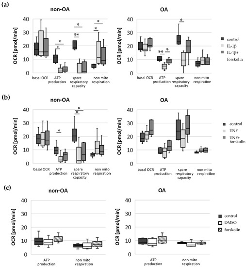 As pointed out in the introduction, elevation of the cAMP level attenuates mitochondrial dysfunction in OA chondrocytes induced by IL-1β. To test whether cAMP affects IL-1β-induced or TNF-induced changes in the oxygen consumption rates and the different calculated mitochondrial parameters in both OA and non-OA chondrocytes, the stimulator of adenylyl cyclase forskolin was applied, together with IL-1β or TNF. The basal OCR did not change significantly after IL-1β or IL-1β + forskolin stimulation in either non-OA chondrocytes or in OA-chondrocytes (Figure 3). In non-OA chondrocytes, the ATP production and spare respiratory capacity both decreased considerably after IL-1β stimulation. This reduction was not significantly modified by forskolin co-application. In contrast, in OA chondrocytes, the reduction of ATP production after IL-1β stimulation was prevented by simultaneous application with forskolin. In non-OA chondrocytes, non-mitochondrial oxygen consumption increased significantly after IL-1β stimulation compared to unstimulated cells, whereas in OA chondrocytes, the increase was weaker and not significant. Co-application of IL-1β with forskolin had no significant effects on the IL-1β-induced increase in non-mitochondrial respiration in non-OA chondrocytes and OA chondrocytes. After stimulation with TNF, the mitochondrial ATP production and the spare respiratory capacity decreased significantly in non-OA chondrocytes, and this did not change significantly after co-application with forskolin. In contrast, we could not measure a significant effect of TNF or TNF + forskolin on OA chondrocytes. Application of forskolin alone did not affect the ATP production and non-mitochondrial respiration of non-OA and OA chondrocytes (Figure 3c). Application of DMSO (1:200, vehicle control) had no effect on these processes (Figure 3c).