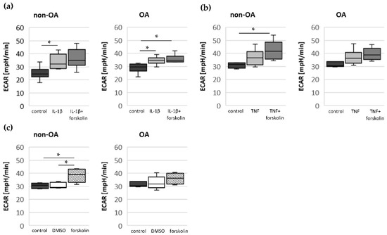Glycolytic rate measured by ECAR in unstimulated cells (control) and after stimulation with (a) IL-1β and forskolin (non-OA patients = 6, OA patients = 7), (b) TNF and forskolin (non-OA patients = 6, OA patients = 6) and (c) forskolin and DMSO (non-OA patients = 6, OA patients = 6). Values are displayed as box plots. Statistics: Kruskal–Wallis test followed by Mann–Whitney U test and Bonferroni correction. * p < 0.05. DMSO: dimethyl sulfoxide; ECAR: extracellular acidification rate.