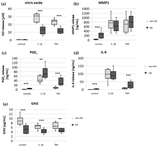 Impact of IL-1β and TNF on the release of NO (a), MMP1 (b), PGE2 (c), IL-6 (d) and GAG (e) in non-OA (number of patients = 8) and OA (number of patients = 10) human hip chondrocytes. Values are displayed as box plots. Statistics: non-OA vs. OA chondrocytes, Mann–Whitney U Test, *** p < 0.005, ** p < 0.01. Control: unstimulated cells.