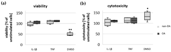Impact of IL-1β and TNF on (a) viability and (b) cytotoxicity of non-OA (number of patients = 6) and OA (number of patients = 4) human hip chondrocytes. Stimulation with dimethyl sulfoxide (DMSO 1:10, number of patients = 5) proved the validity of the tests. Values are normalized to unstimulated cells and displayed as box plots. Statistics: non-OA/OA/DMSO vs. unstimulated cells, Mann–Whitney U test; no significant differences were found between IL-1β-/TNF-stimulated vs. unstimulated chondrocytes. ** p < 0.01 and * p < 0.05.