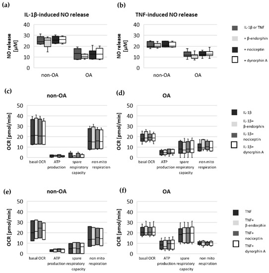 Impact of opioid neuropeptides on the (a) IL-1β-induced and (b) TNF-induced release of NO (non-OA patients = 5, OA patients = 8) and on the (c,d) IL-1β-induced (non-OA patients = 4, OA patients = 6) and (e,f) TNF-induced (non-OA patients = 3, OA patients = 5) changes in basal oxygen consumption rate, mitochondrial ATP production, spare respiratory capacity and non-mitochondrial respiration in non-OA and OA chondrocytes. Values are displayed as box plots. Statistics: Kruskal–Wallis test; no significant differences were found within the groups.