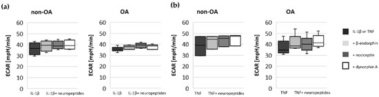 Impact of opioid neuropeptides on glycolytic activity measured by ECAR after stimulation with (a) IL-1β and opioid neuropeptides (non-OA patients = 4, OA patients = 6) and (b) TNF and opioid neuropeptides (non-OA patients = 3, OA patients = 5). Values are displayed as box plots. Statistics: Kruskal–Wallis test; no significant differences were found within the groups. ECAR: extracellular acidification rate.