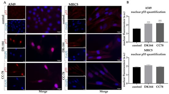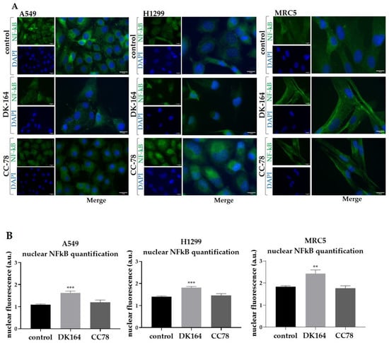 3.6. The Effect of DK-164 and CC-78 on the Cellular Localisation of the Regulatory Proteins NF-kB and p53 in Lung Cells