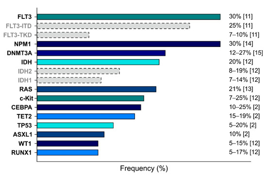 AML is a highly complex disease characterized by a plethora of cytogenetic alterations and genetic mutations, which are used to classify AML. Figure 1 shows the frequencies of the most relevant mutations described for AML, which affect the following genes: Fms-Like Tyrosine Kinase 3 (FLT3) [11], KIT [12], RAS [13], Nucleophosmin 1 (NPM1) [14], CCAAT Enhancer Binding Protein α (CEBPA) [2], Runt-related transcription factor (RUNX1) [12], DNA methyltransferase 3A (DNMT3A) [15], Isocitrate dehydrogenase (IDH) [12], Ten–eleven translocation 2 (TET2) [2], Additional sex comb-like 1 (ASXL1) [2], Wilms’ tumor 1 (WT1) [12], and Tumor protein 53 (TP53) [2].