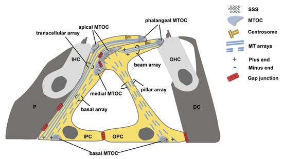 In proliferating animal cells, MT nucleation and anchorage occur in the centrosome. However, in most differentiated animal cells, such as epithelial cells, MTs are anchored in non-centrosomal MTOCs []. Mature PCs are differentiated epithelial cells. Mature inner pillar cells (IPCs) have four cell-surface-associated MTOCs (Figure 1). One of them is apically located at the tip of the cell’s phalangeal process near the centrioles. The other three are, respectively, situated in apical, medial, and basal positions away from the centrioles. The MT bundles of IPCs consist of two closely aligned MT arrays (transcellular array and basal array) (Figure 1). The transcellular array is anchored at the phalangeal MTOC, while the basal array is anchored at the medial MTOC. Both of them span the longitudinal axis of the IPC downwards to the basal plasma membrane []. Mature outer pillar cells (OPCs) have three cell-surface-associated MTOCs, respectively, located at the tip of the cell’s phalangeal process and apical and basal sites. Two MT arrays are, respectively, anchored at the phalangeal MTOC (beam array) and the apical MTOC (pillar array) (Figure 1). In mature OPCs, the beam array spans parallel to the apical cell surface while the pillar array extends parallel to the cell’s apicobasal axis []. Under the electron microscope, concentrations of specialized cytoskeletal materials and junctions, called surfoskelosomes (SSSs), are observed at MTOCs of PCs and connect MT ends to the cell surface [,].