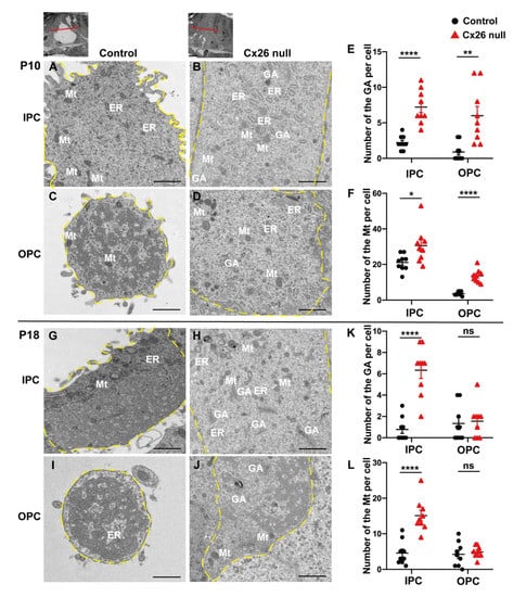 Impaired degradation of organelles in PCs and hypertrophy of PCs in Cx26-null mice. (A–D) TEM cross-sections obtained from the middle turn in the cochlea show the ultrastructure of IPCs and OPCs at P10; (E,F) Quantifications of the changes of the Mt and GA at the middle turn in the control and Cx26-null groups (9 IPCs and 9 OPCs from 3 mice in each group) at P10. The number of the GA: 2.2 ± 0.3 (control) vs. 7.2 ± 0.8 (Cx26 null) in IPCs, 0.9 ± 0.4 (control) vs. 6.0 ± 1.3 (Cx26 null) in OPCs. The number of the Mt: 21.1 ± 1.5 (control) vs. 30.6 ± 3.3 (Cx26 null) in IPCs, 3.7 ± 0.4 (control) vs. 13.6 ± 1.2 (Cx26 null) in OPCs. (G–J) TEM cross-sections obtained from the middle turn in the cochlea show the ultrastructure of IPCs and OPCs at P18. (K,L) Quantifications of the changes of the Mt and GA at the middle turn in the control and Cx26-null groups (9 IPCs and 9 OPCs from 3 mice in each group) at P18. The number of the GA: 0.8 ± 0.4 (control) vs. 6.3 ± 0.8 (Cx26 null) in IPCs, 1.3 ± 0.6 (control) vs. 1.6 ± 0.5 (Cx26 null) in OPCs. The number of the Mt: 4.6 ± 1.1 (control) vs. 15.1 ± 1.5 (Cx26 null) in IPCs, 4.2 ± 1.1 (control) vs. 4.9 ± 0.5 (Cx26 null) in OPCs. Small images (scale bars: about 10 μm) at the top show the assessed levels of these horizontal sections. Hypertrophic cell body (broken yellow lines) of PCs was observed in Cx26-null group (D,H,J). Data are expressed as mean with SEM; * p < 0.05, ** p < 0.01, **** p < 0.0001, ns: no significant difference, TEM: transmission electron microscopy, P: postnatal, IPC: inner pillar cell, OPC: outer pillar cell, Mt: mitochondria, GA: Golgi apparatus, ER: endoplasmic reticulum. Bars: about 1 μm.