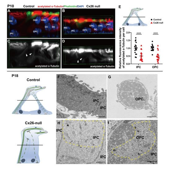 In Cx26-null mice, the immunolabeling of acetylation α-Tubulin of the longitudinal MT arrays was decreased at P10 (1.00 ± 0.09 (control) vs. 0.50 ± 0.07 (Cx26 null) in IPCs and 1.00 ± 0.04 (control) vs. 0.49 ± 0.07 (Cx26 null) in OPCs, p < 0.0001) (Figure 3A–E). In addition, cluttered and absent MTs that were anchored at the medial MTOC in IPCs or apical MTOC in OPCs were observed in the Cx26-null group at P18 (Figure 3H,I).