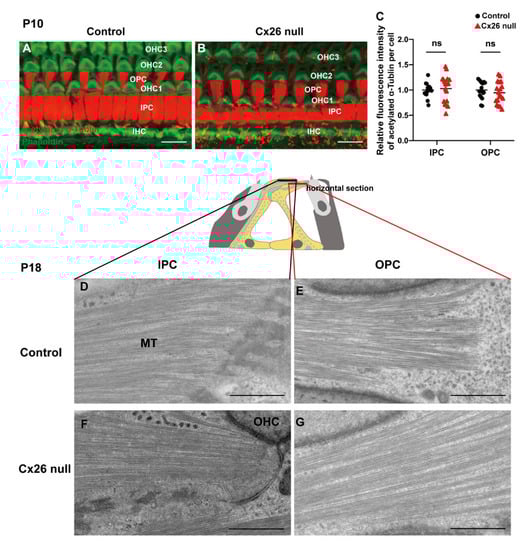 Normal organization of MTs, which are anchored at non-centrosomal MTOCs near centrosome. (A,B) Immunofluorescence staining of acetylated α-Tubulin in the apical cochlea at P10. (C) Quantification of immunolabeling for acetylated α-Tubulin in IPCs and OPCs from the control and Cx26-null groups (18 IPCs and 18 OPCs from 3 mice in each group) at P10. The assessed levels are displayed in plot A,B. The relative fluorescence intensity of acetylated α-Tubulin: 1.00 ± 0.03 (control) vs. 1.03 ± 0.06 (Cx26 null) in IPCs, 1.00 ± 0.04 (control) vs. 0.95 ± 0.05 (Cx26 null) in OPCs—data are expressed as mean with SEM, ns: no significant difference. (D–G) TEM horizontal sections of PCs obtained from the middle turn in the cochlea at P18. Schematic diagrams (middle) display the assessed levels of (D–G). P: postnatal, TEM: transmission electron microscopy, MT: microtubule, IHC: inner hair cell, OHC: outer hair cell, IPC: inner pillar cell, OPC: outer pillar cell. Bars: about 10 μm (A,B), about 1 μm (D–G).