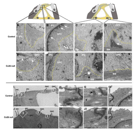 The detailed procedure has been described in our previous studies [,]. Three mice were used in the control and Cx26-null groups, respectively. Mice were anesthetized and sacrificed at P10 and P18. The cochleae were fully fixed in a mixture of 2% paraformaldehyde and 2.5% glutaraldehyde in 0.1 M PB, then decalcified in 10% disodium EDTA (pH 7.2) and post-fixed for 1 h in 1% osmium tetroxide. After dehydration, the cochlea was embedded in resin, sectioned (80 nm in thickness), and stained with uranyl acetate and lead citrate. Then, ultrathin sections were observed by using electron microscopy examination (FEI Tecnai G2 20 TWIN; Hillsboro, OR, USA).