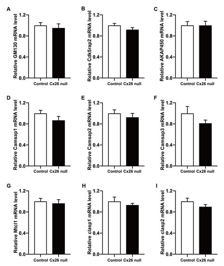 No changes were found in the mRNA expression levels of non-centrosomal MT nucleation- and anchorage-associated proteins. (A–I) The mRNA expression levels of GM130, Cdk5rap2, AKAP450, Camsap1, Camsap2, Camsap3, Mtcl1, Clasp1, and Clasp2 in the cochlear basilar membrane at P6. There was no significant difference between the control and Cx26-null groups (6 mice in each group, p > 0.05).