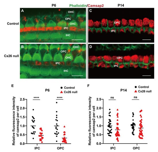 At P6, we found camsap2 was only expressed in the apical sites of PCs between two groups (Figure 7A,B). Quantification of immunolabeling showed the expression levels of camsap2 were reduced in IPCs (1.00 ± 0.10 (control) vs. 0.46 ± 0.06 (Cx26 null), p < 0.0001) and OPCs (1.00 ± 0.13 (control) vs. 0.32 ± 0.06 (Cx26 null), p < 0.0001) in the Cx26-null group at P6 (Figure 7A,B,E). As the cochlea gradually matured, we found that the protein expression of camsap2 returned to normal (Figure 7C,D and Supplementary Materials Figure S1). There was no statistically significant difference in the fluorescence intensity of camsap2 in PCs’ MTOCs, including medial MTOCs in IPCs, apical MTOCs in OPCs (Figure 7F), and both phalangeal MTOCs in PCs at P14 (Supplementary Materials Figure S1).