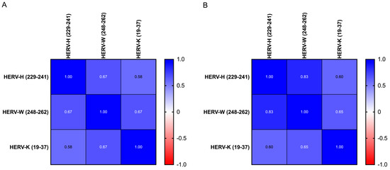 Heatmap displaying the r values obtained from Spearman’s correlation analysis performed among HERV-H-, HERV-W- and HERV-K-derived epitopes in ASD children (A) and in HC children (B).