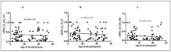 Linear regression between HERVs antibody levels and age of all participants (children and mothers). (a) shows the linear regression between anti-HERV-H and age; (b) shows the linear regression between anti-HERV-K and age; (c) shows the linear regression between anti-HERV-W and age.95% CI, confidence interval fixed at 95%. Statistical significant levels fixed at * p < 0.05.