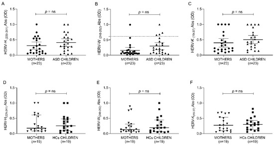 ELISA-based analysis of antibody presence against HERV-H-, HERV-W- and HERV-K-derived epitopes. Plasma samples from ASD and HCs populations were tested against HERV-H (229–241) (A,D), HERV-W (248–262) (B,E) and HERV-K (19–37) (C,F). Scatter plots represent median with 95% of CI. The Mann–Whitney p-value is indicated in the upper part of each graph.