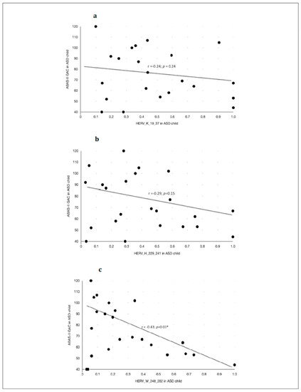 Caption title. Scatter plots of the Pearson’s correlation test between the ABAS-II questionnaire—GAC (Global Adaptative Composite)—Score and the anti-HERVs levels in children with ASD. (a) Association between anti-HERV-K and the Global Adaptive Composite Score of the ABAS-II questionnaire in children with ASD diagnosis. (b) Association between anti-HERV-H and the Global Adaptive Composite Score of the ABAS-II questionnaire in children with ASD diagnosis. (c) Association between anti-HERV-W and the Global Adaptive Composite Score of the ABAS-II questionnaire in children with ASD diagnosis. Statistical significant levels fixed at * p < 0.05.