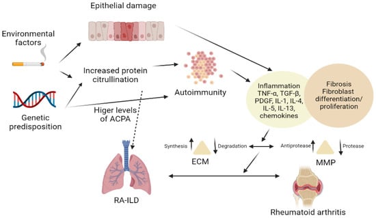 The pathophysiology of IPF is influenced by matrix metalloproteinases (MMPs) and tissue inhibitors of metalloproteinases (TIMPs), but also by cytokines and chemokines. MMP-7 levels were regularly observed to be higher in IPF patients. Several studies have looked at the involvement of these proteins in interstitial lung involvement in RA patients. High levels of MMP-7, soluble programmed death-ligand 1, C-X-C motif chemokine ligand 10 (CXCL10), interleukin (IL)-13, and IL-18 were discovered in the serum of patients with lung involvement in RA [49,50].