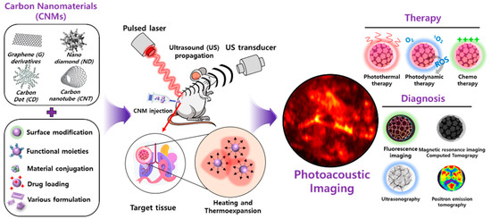 The discovery of carbon nanomaterials (CNMs) has impacted many aspects of nanotechnology and has contributed to significant developments in physics, electronics, optics, mechanics, biology, and medicine [1,2,3]. CNMs exhibit fast electron transfer kinetics and better electrocatalytic activity, unique magnetic and optical properties, chemical versatility with ease of manipulation, biocompatibility, and performance as a chemically robust platform [4,5]. Herein, we evaluate the potential of CNMs for their photoacoustic imaging (PAI) application by categorizing them into graphene (G) and their derivatives (i.e., graphene oxide (GO) and reduced graphene oxide (rGO), carbon nanotubes (CNTs), nanodiamonds (NDs), carbon dots (CDs), and diverse types of carbon nanoparticles (CNPs)). The formulation of CNMs, including surface modification, functionalization with drugs/inorganic/organic materials, and fabrication method, enhances both PA signal intensity and theragnosis versatilities (Figure 1).