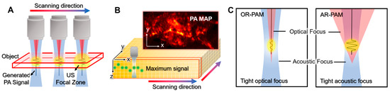 Schematic illustrations of PAM. (A) Scanning mechanism of PAM. (B) PA MAP image generation from volumetric data. (C) The optical and acoustic foci in OR-PAM and AR-PAM. PA, photoacoustic; PAM, photoacoustic microscopy; US, ultrasound; MAP, maximum amplitude projection; OR-PAM, optical-resolution PAM; AR-PAM, acoustic-resolution PAM.